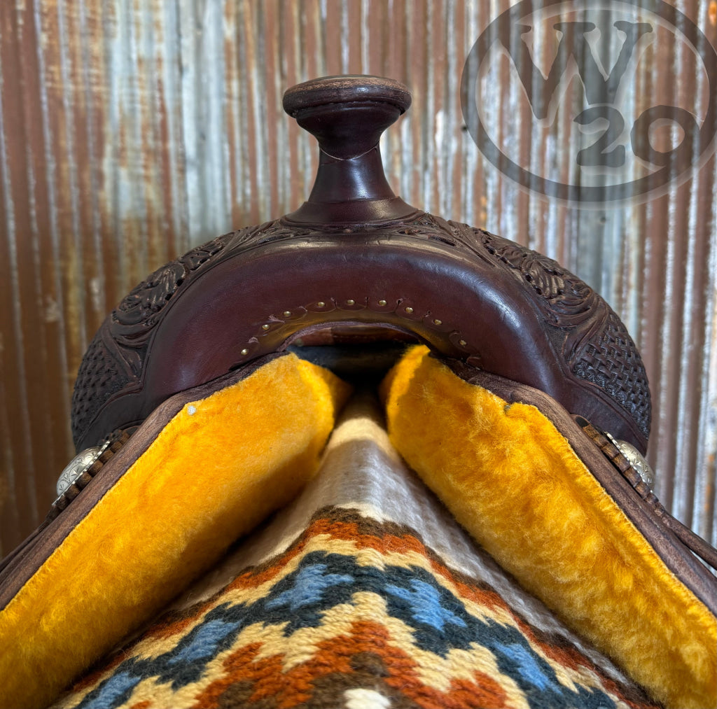 - Fenders and Stirrups: Pre-turned Fender, Leather Covered Bell Stirrups with Basket Weave Tooling.