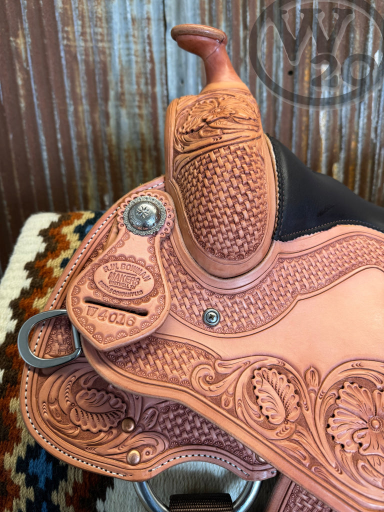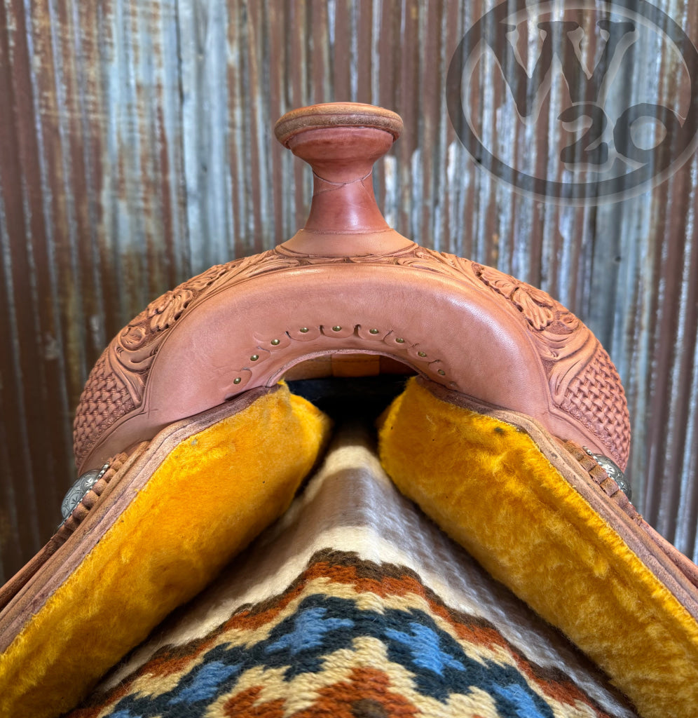 - Fenders and Stirrups: Pre-turned Fender, Leather Covered Bell Stirrups with Basket Weave Tooling.