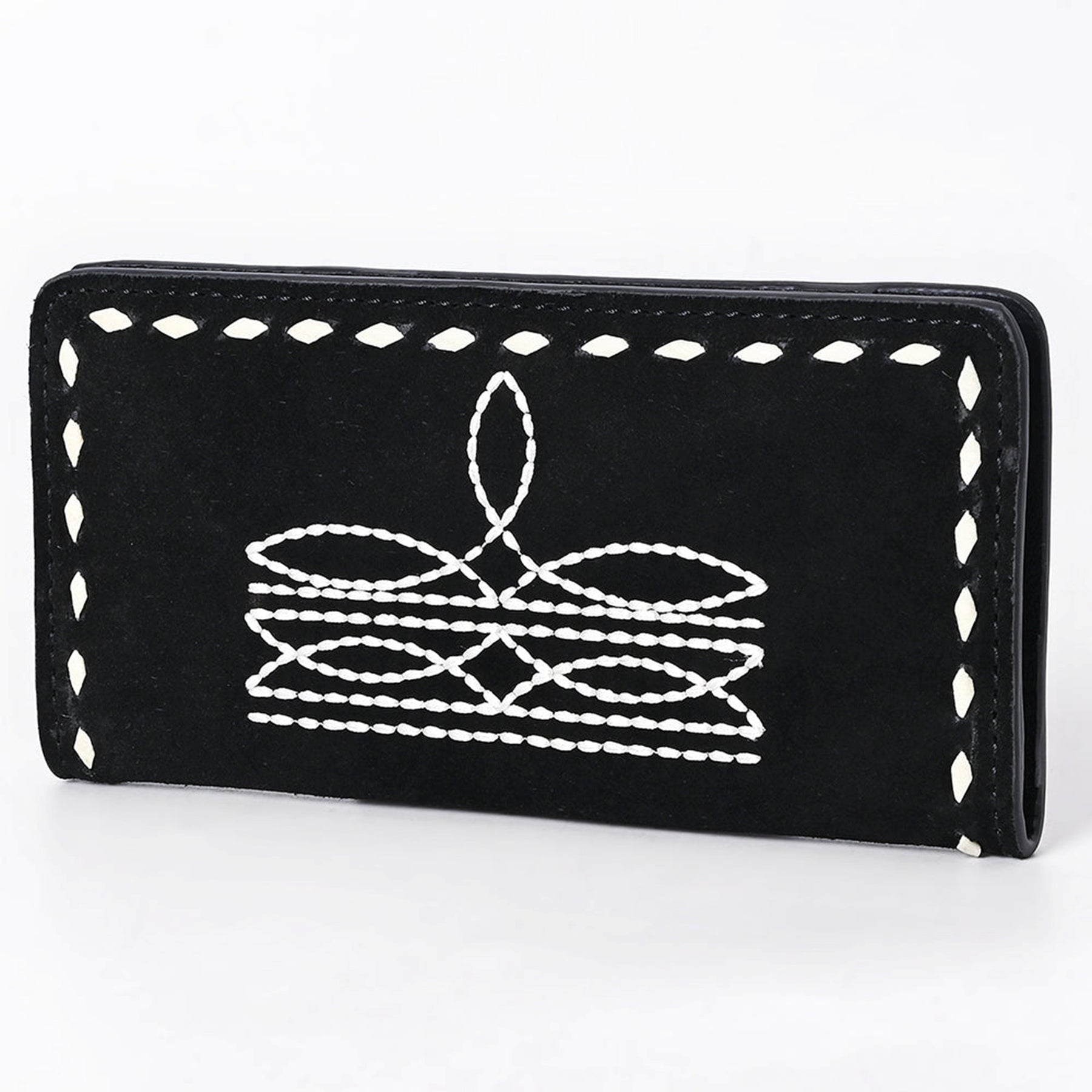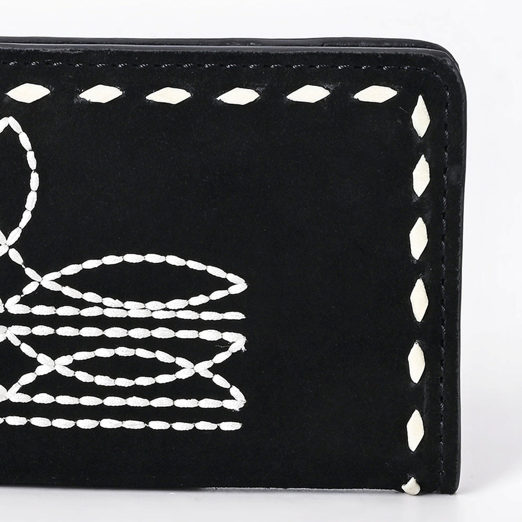 Carry your cash and cards in classic Western fashion with this handcrafted black suede leather wallet. Featuring bold white whipstitch embroidery in a crown-like motif and detailed border stitching, this wallet offers both durability and distinctive style.
