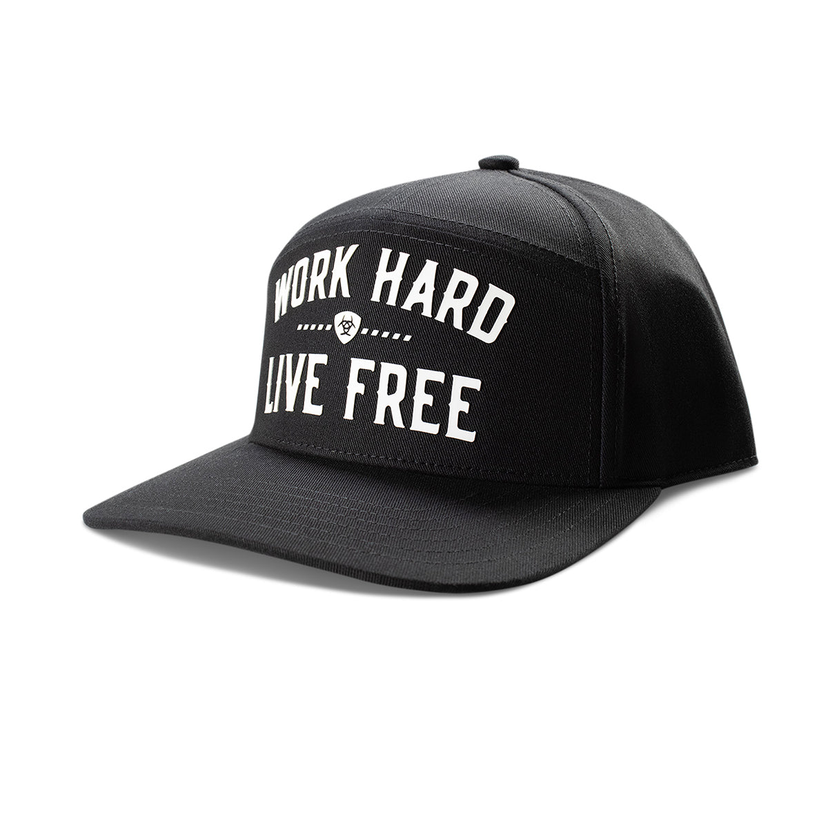 Ariat Work cap by M&F Western Products. WORK HARD LIVE FREE embroidered logo on the front. Fabric back panels. Snap back closure for that perfect fit.
