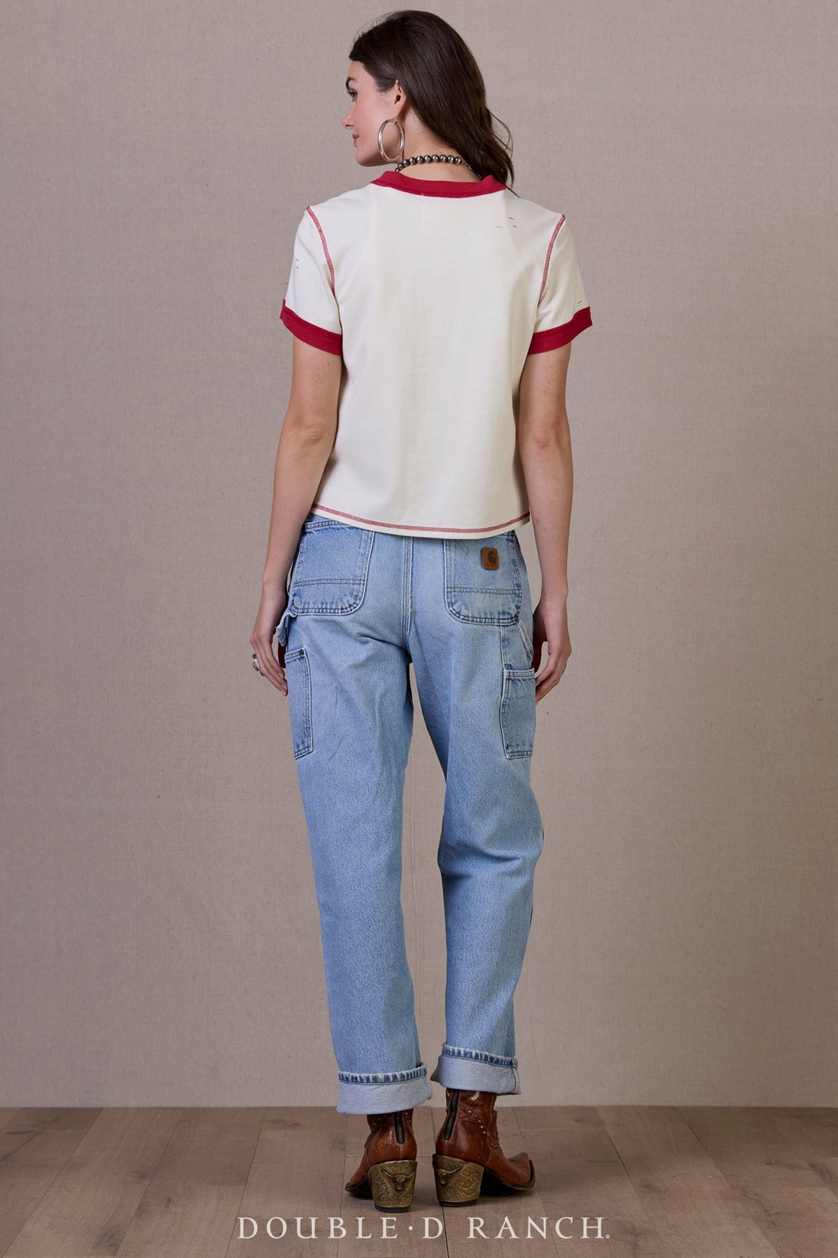 Better outlaws than in-laws, right? (Kidding.) This top has such a fun throwback vibe with the ringed collar and sleeves, complemented by the contrast stitching and the bold red “outlaw” emblem emblazoned front and center, embellished with a bit of embroidery. It has a vibe of girly-yet-gritty.