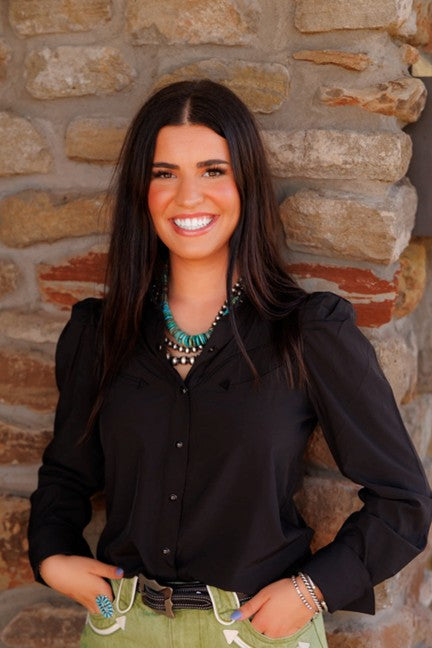 Meet the Howdy Hanny Women's Black Performance Pearl Snap Shirt—where classic Western style meets modern performance technology. This sleek black shirt combines the timeless appeal of pearl snap closures with advanced performance fabric designed to keep you comfortable from sunup to sundown.