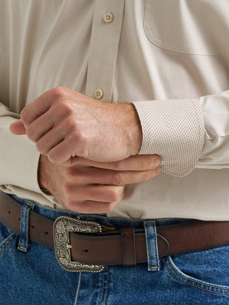 Stock up on a great-looking solid that gives you endless options. Signature George Strait logo embroidery guarantees you've chosen the gold standard of comfort. This long-sleeve button-down features a straight back yoke, one chest pocket, and adjustable cuffs. With its relaxed fit, this classic collared shirt offers plenty of room through the shoulders and torso.