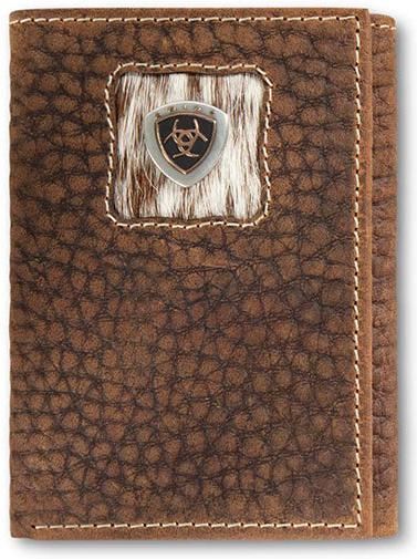This Ariat trifold wallet by M&F Western Products is genuine leather. It has a brown textured leather body and brown and white calf hair inlay, which features a multi finish Ariat logo concho. Multiple card slots, cash slot and ID window on the inside.