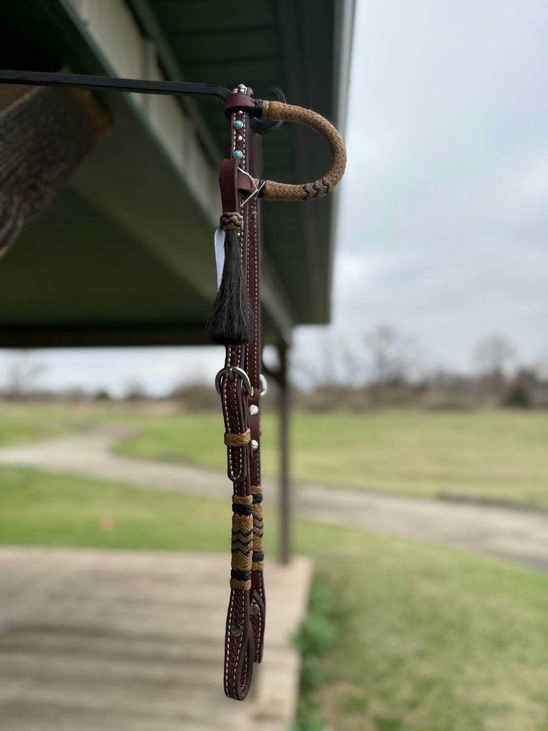 Dutton Bits Medium Oiled Basket Stamp Slip Ear Headstall with Turquoise Rawhide Knot Accents