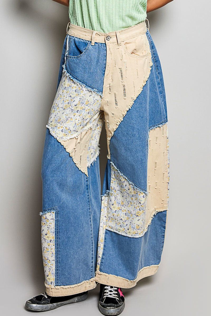 POL Women's Denim High Rise Twill Patchwork Pants